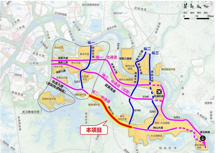 該項(xiàng)目屬于武鄂黃黃“三橫”南通道中的一段,路線全長(zhǎng)27.949 公里,項(xiàng)目總投資約為18億元。項(xiàng)目的實(shí)施將進(jìn)一步加強(qiáng)武鄂黃黃的交通路網(wǎng)建設(shè),有利于加快推動(dòng)武鄂黃黃同城化發(fā)展,對(duì)加快黃石融入武漢都市圈的核心區(qū)具有重要意義。